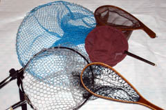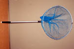 廃品のお風呂掃除用タワシのアルミの柄を使い、先端に玉網用連結金具をエポキシ系樹脂で固定し、振り出し玉網のフレームとネットをつけました。大きなネットは湖でのマス釣りに重宝します。万一(?)大物が来ても安心です。このネットの良いところは、海釣り用には良くある4つ折の折りたたみフレームなので、たたんで柄からはずすと全部リュックサックやロッドケースに入ってしまうという点です。