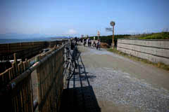 砂が吹きだまり、車輪を取られてしまう場所があります。また歩行者やサーフボードをくっつけた自転車も多く、その分かえって高速走行の自転車はいませんが、それでも走行には多少注意が必要です。特に夏場は大変な人出になりますので、海水浴の季節は避けた方が良いかもしれません。 |