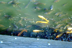 小さい川にはコイが群れていることがよくありますので、我家では出発前に食パンの耳を用意しておいて、群れが見えるとここぞとばかりに投入して、コイの大群の大騒ぎを楽しみます。コイにばら撒くために、というのもはばかられますが、パン屋さんでお願いすると、パンの切れ端が大量に詰まったビニール袋を数十円で譲ってくれることもあります。