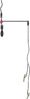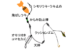 大物に対応できるよう、天秤やクッションゴムを使います。また仕掛けがウキに絡まないようにする絡み防止棒(からまんぼう)などの工夫が施されます。 |