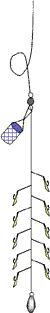 右の仕掛けは5号ウキ、錘の入った小型のコマセカゴ、二本針の、小物向けの簡単なカゴ釣り仕掛けです。このままのセットで釣具店で販売されています。二本針の上の針は魚皮の付いたサビキ針になっています。下の針の上にガン玉が付いていて適度に沈み、こちらにエビなど刺し餌をつけます。2本針の代わりにサビキ仕掛けをつけ、遠投サビキにして釣ることもあります。