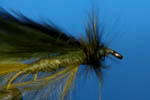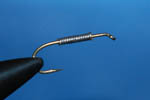 オリーブのスレッド6/0を巻いてボディを作ります。本当ならもっと細いスレッドで繊細にしたほうが良いと思います。ま、ウチの場合は気分次第で。 |